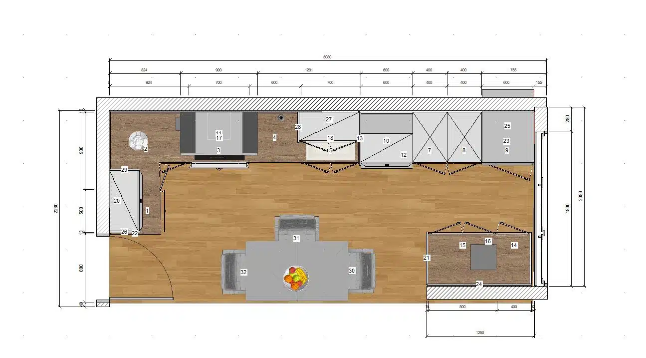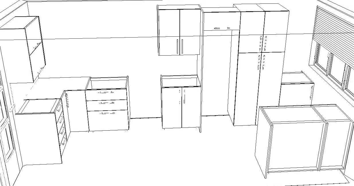 Cocina completa con lavavajillas, campana decorativa, cajones y un cacerolero, incluso con mueble sobrefrigo. Todos los muebles son de 80cm de alto, tanto los bajos como los altos