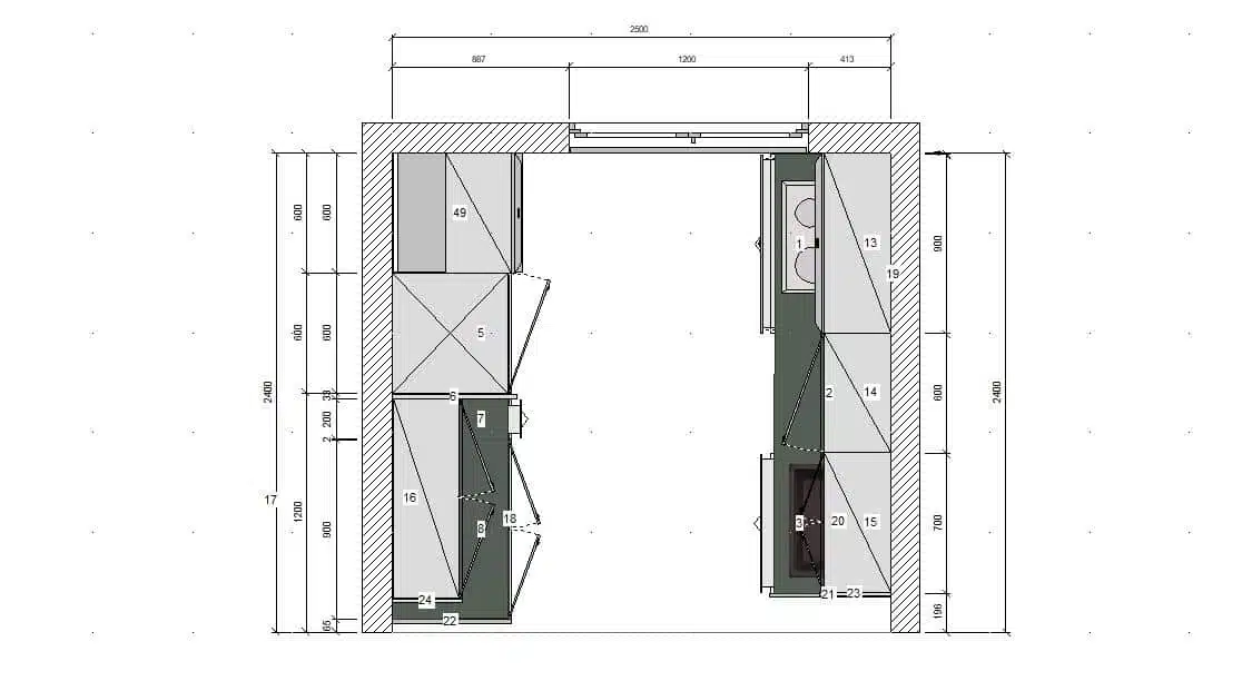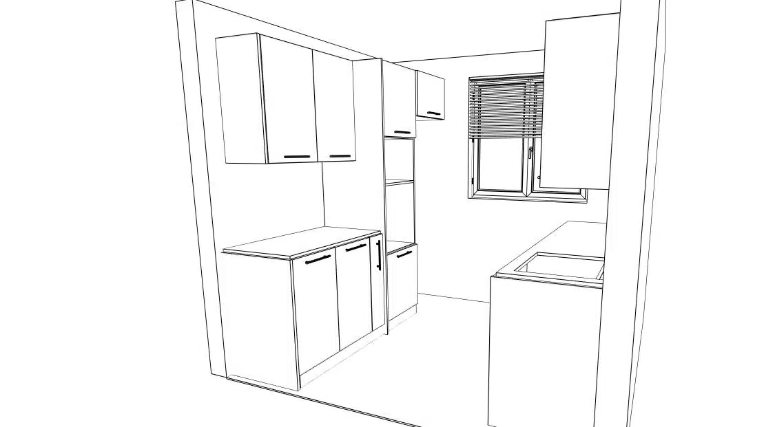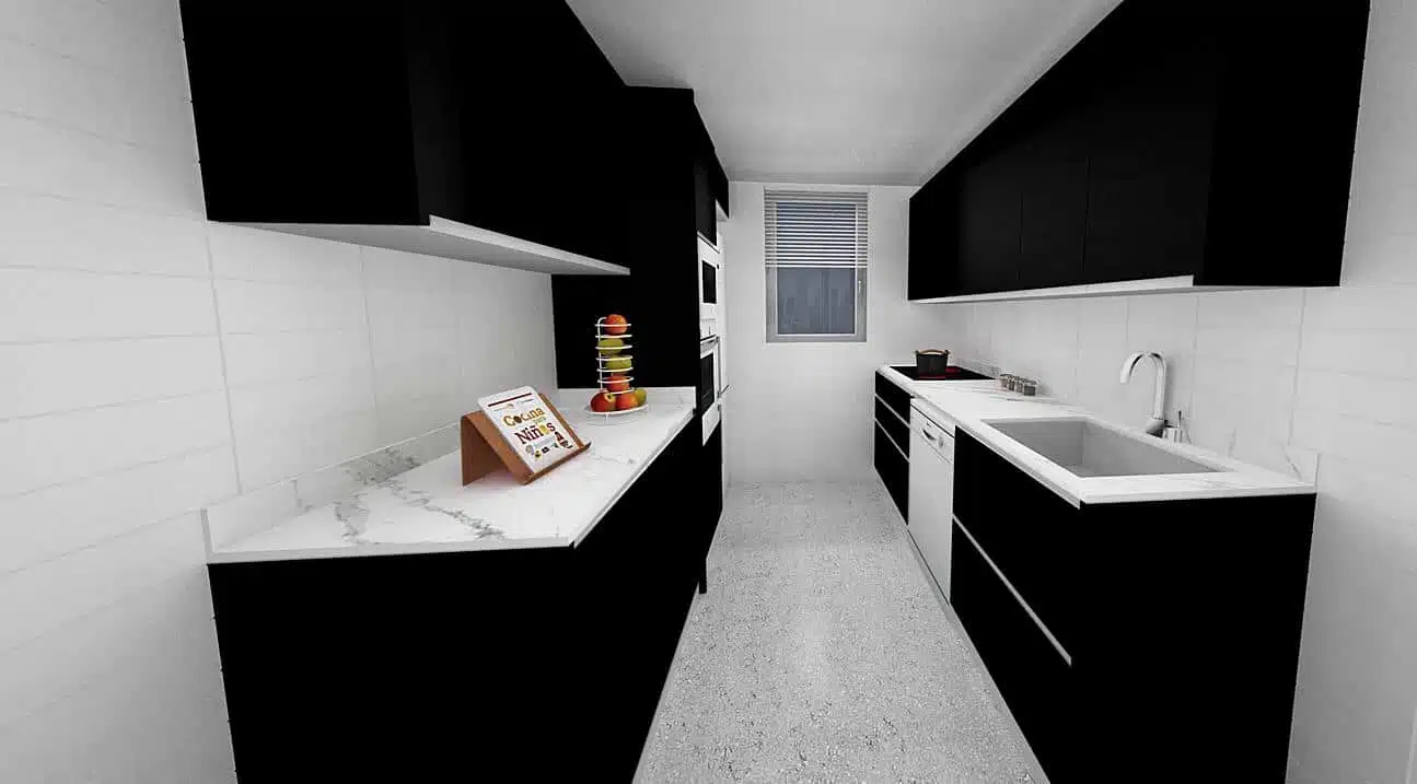 Cocina rectangular con muebles a ambos lados de la estancia. Muebles perfectamente encajados y predispuestos de tal manera que hacen de este espacio una cocina funcional a la vez que acogedora.