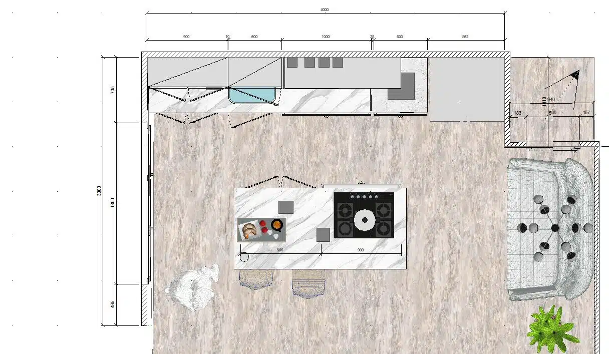 Amplia cocina perfectamente integrada en una vivienda tipo loft. Isla con gran zona de trabajo a la vez que espacio suficiente para comer en familia.