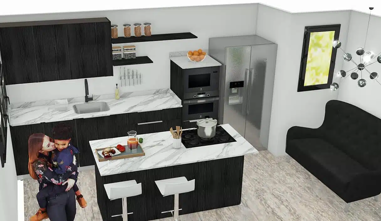 Estilo de la cocina tipo oriental, acabados negros combinando en blanco o maderas. La columna del horno y microondas a media altura hace que la zona no quede sobrecargada.